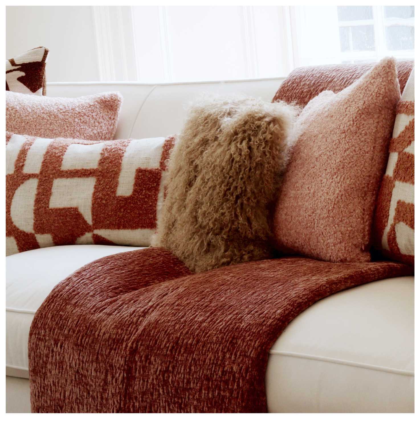 The rusty rose colour of this rippled velvet throw lends a depth and warmth to a scheme. We used it as a foil to otherwise paler tones.